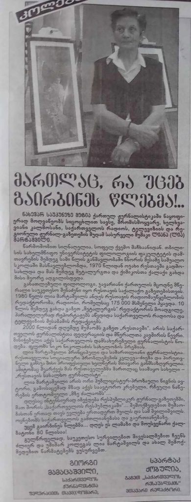 …„შენ უნდა სოფლისა ყოფილიყავ, მარტო საჯალაბო ვერ იქნებოდიო“ – უთქვამს პოეტს და მართლაც, ქალბატონი ლია მარტაშვილი ყველასია, მთელი ქვეყნისაა, რუსთავისაა, მაგრამ მაინც ჩვენია, სკოლის თითოეულ პერსონაზე მზრუნველი და მოამაგე, აღმზრდელი და გულშემატკივარი. ამიტომაც გვიყვარს ყველას, დიდსა და პატარას. გვიხარია მისი ქომაგობა და საოცარი კახური იუმორით შეზავებული შემართება, სიცოცხლით და ხალისით რომ გვილამაზებს ყოფას.